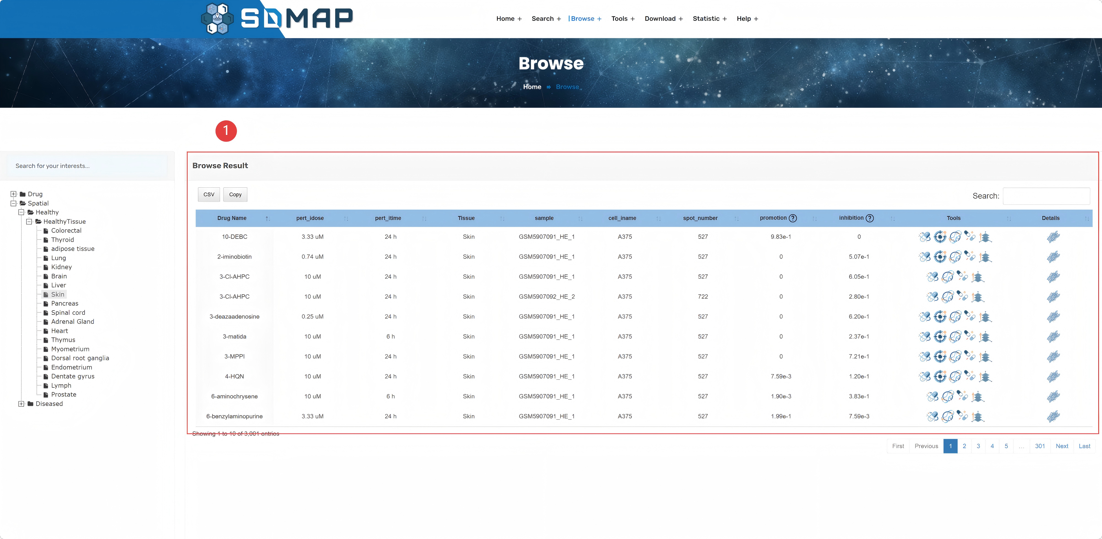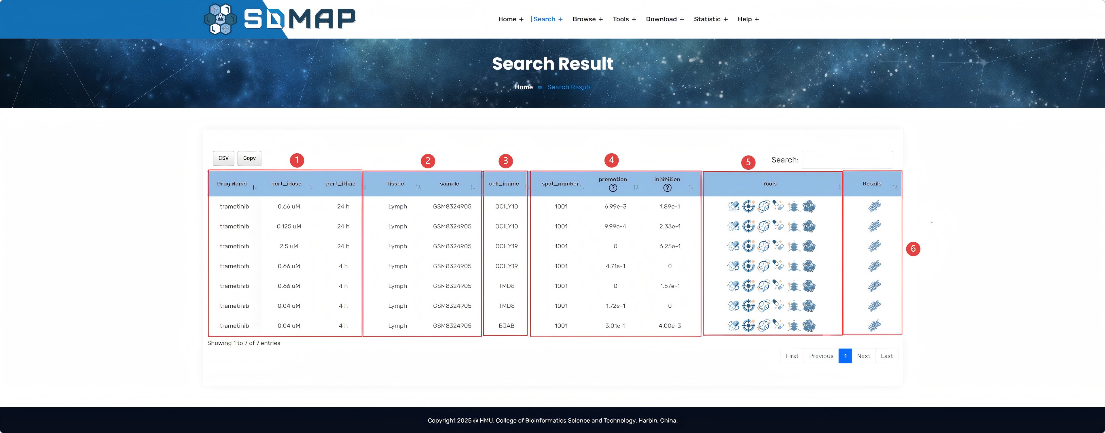 Users can systematically explore the differences in perturbation scores between different regions of tissues under the combined conditions of drug concentration, action time, and cell lines. The database supports: