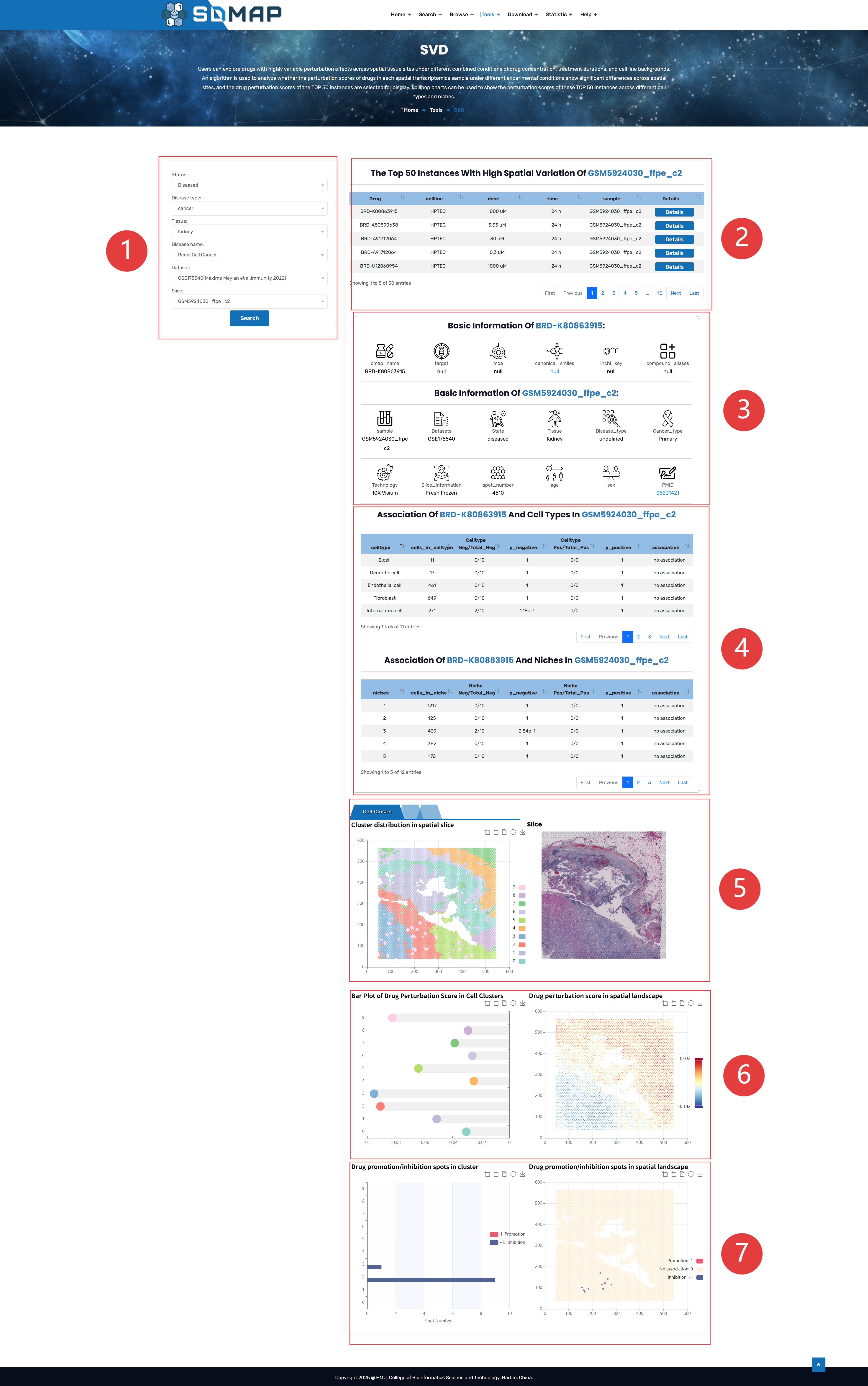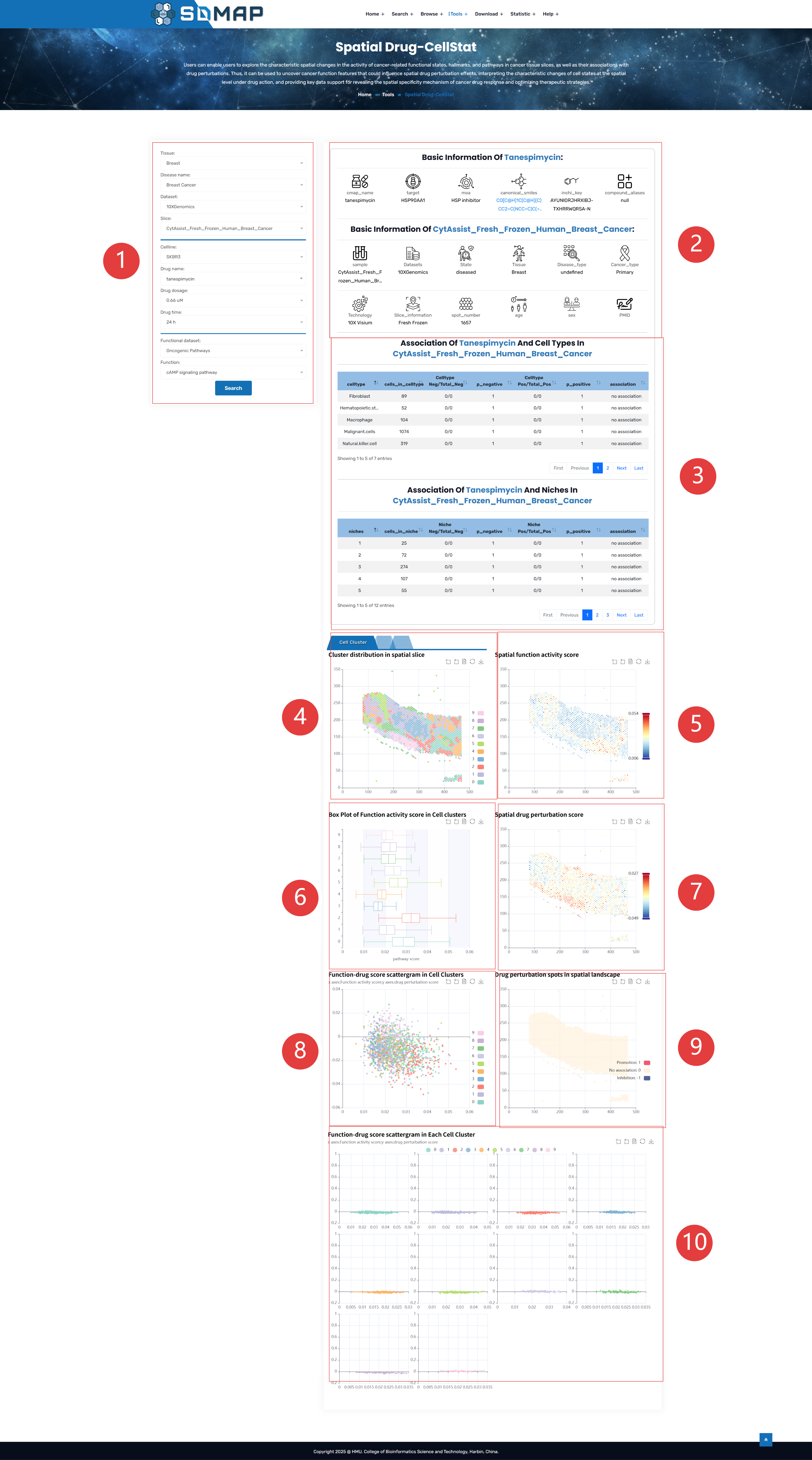 1.Users can select the single-cell resolution spatial transcriptome samples as well as drugs they are interested in visualizing, and at the same time can zoom in on local areas via xy.