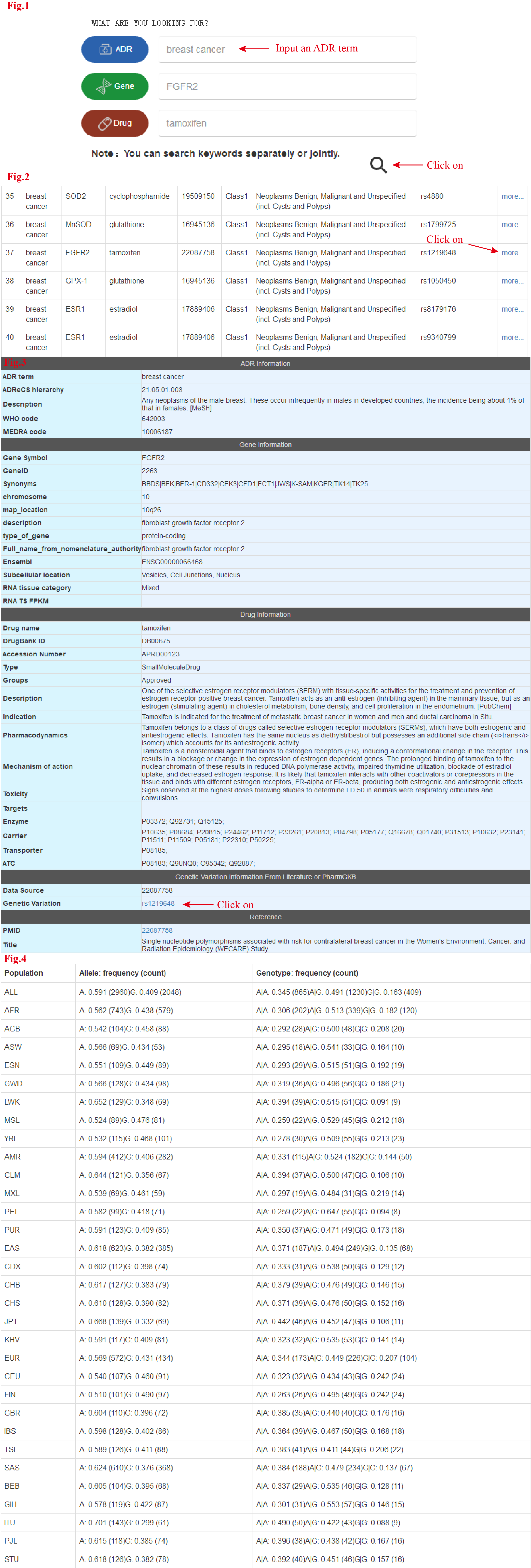 Step 3:The final results page contains detailed ADR informations,gene informations,drug informations,SNP Information From GWAS,reference informations.(Fig.3)