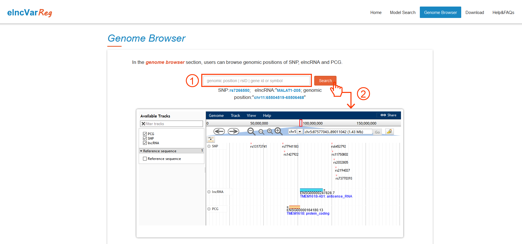 In the genome browser section, users can browse genomic positions of SNP, elncRNA and PCG.