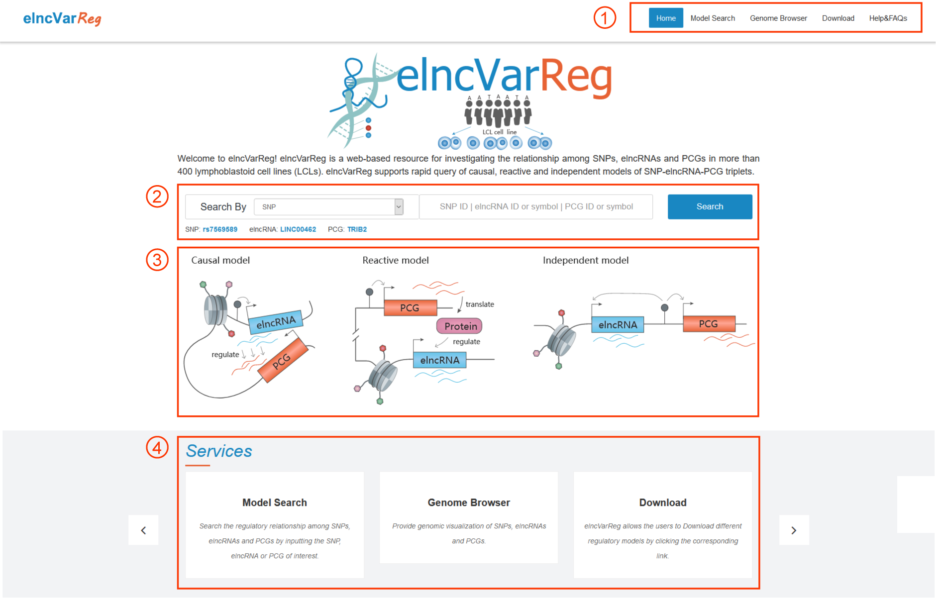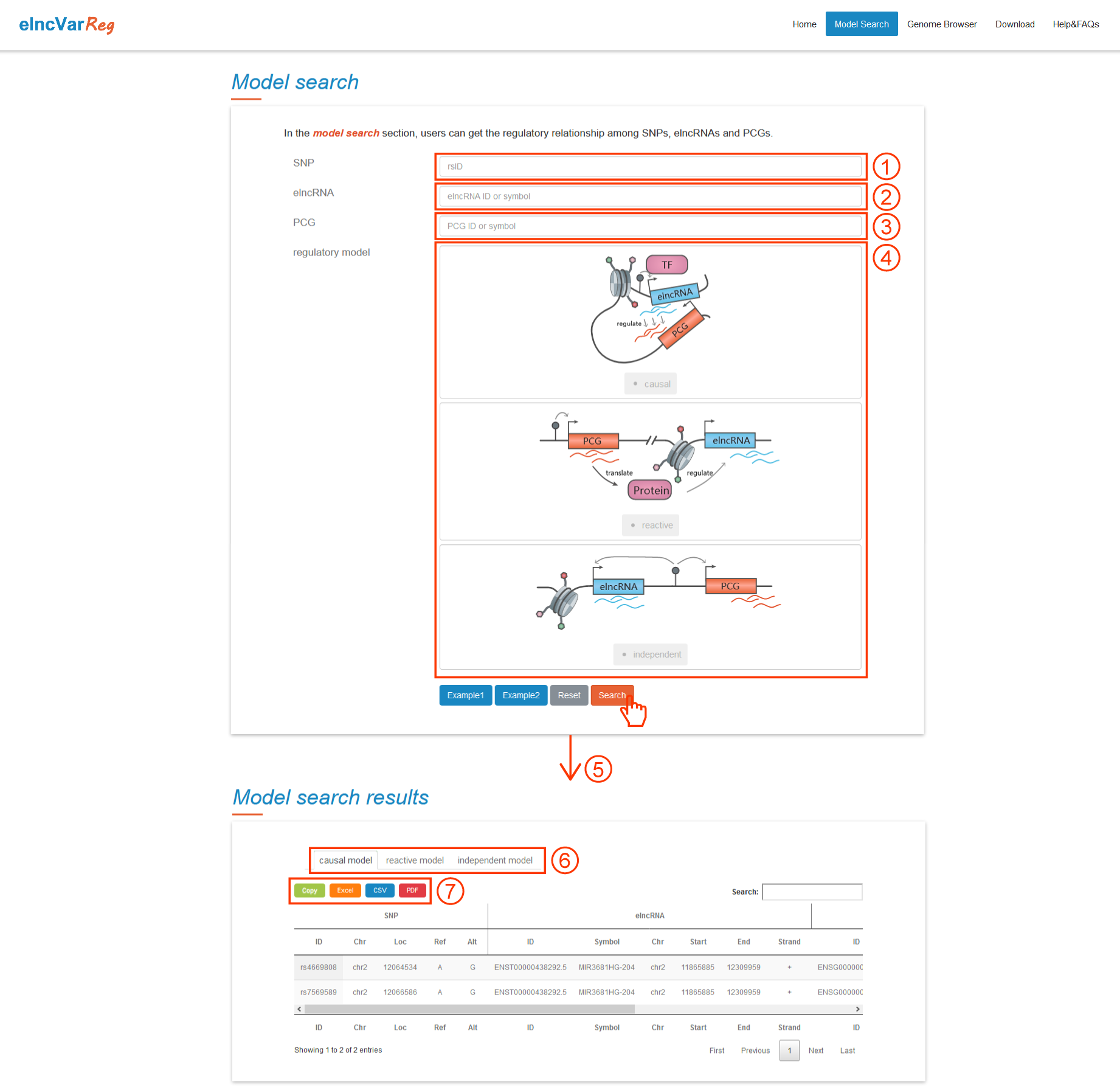 In the model search section, users can get the regulatory relationship among SNPs, elncRNAs and PCGs.