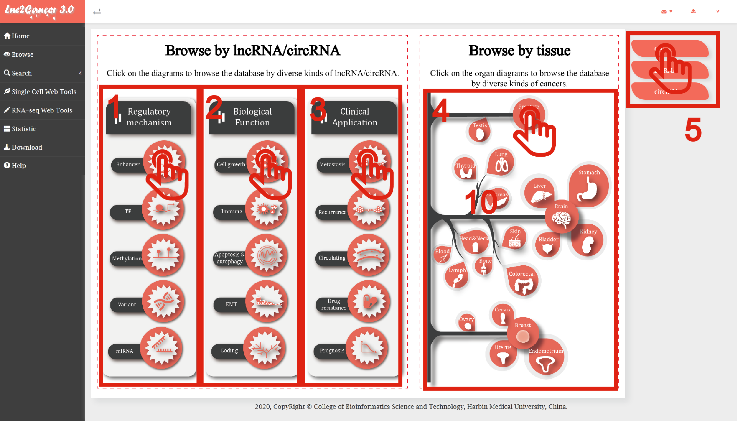 5. Quick browse of cancers, lncRNAs and circRNAs.