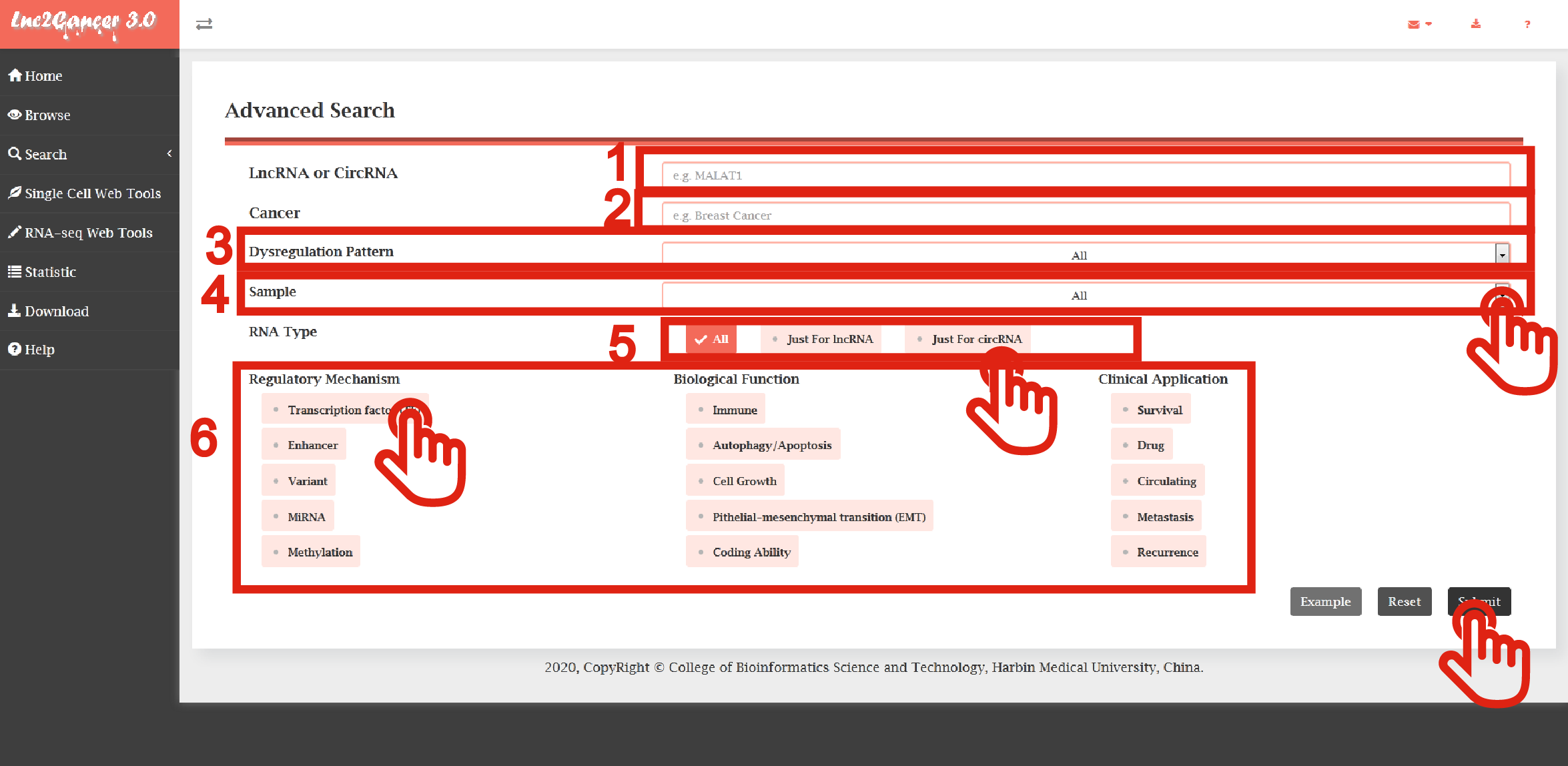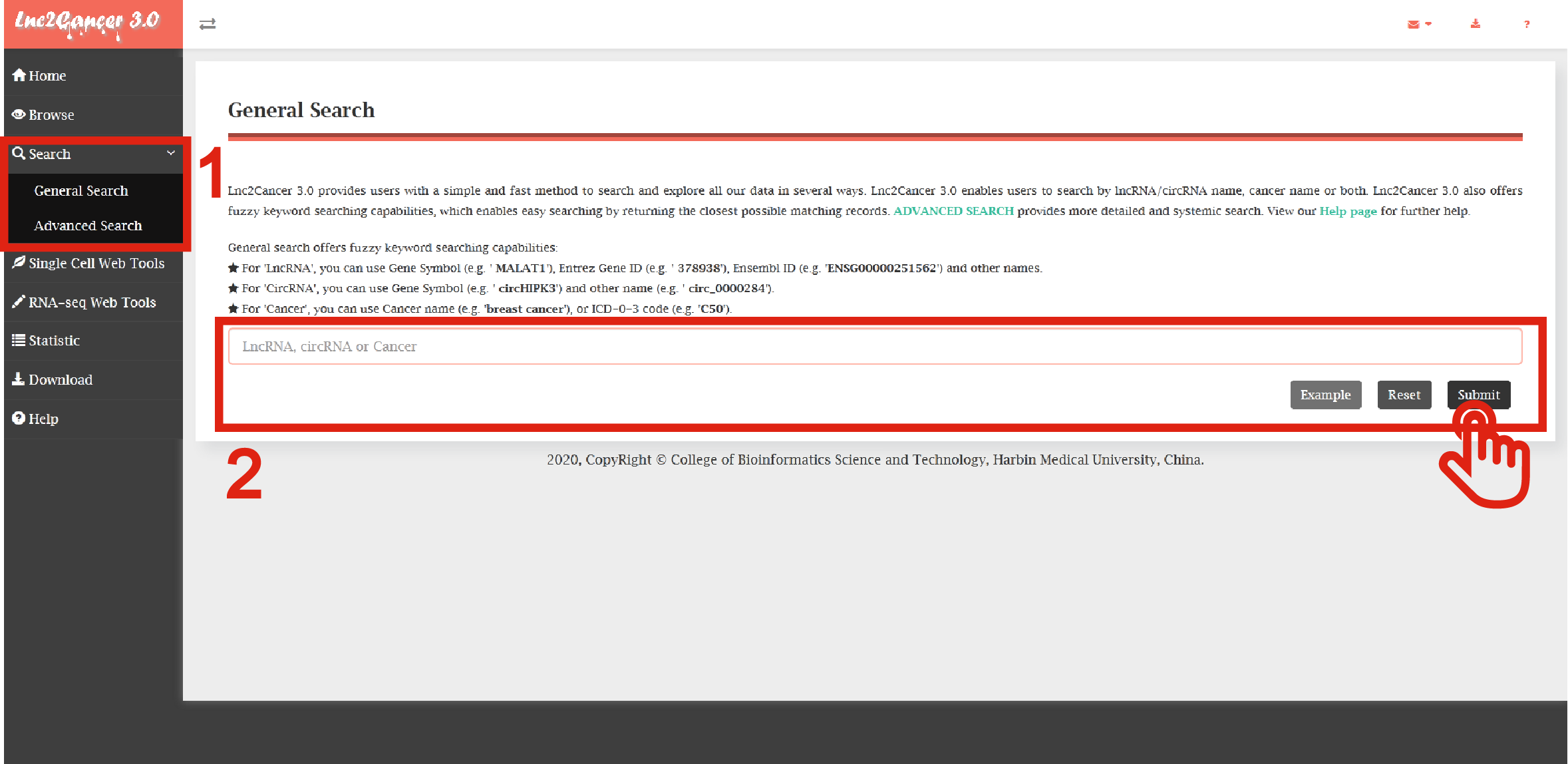 Lnc2Cancer 3.0 provides general search and advanced search. The Search page is displayed in Figure 3-1 and Figure 3-2: