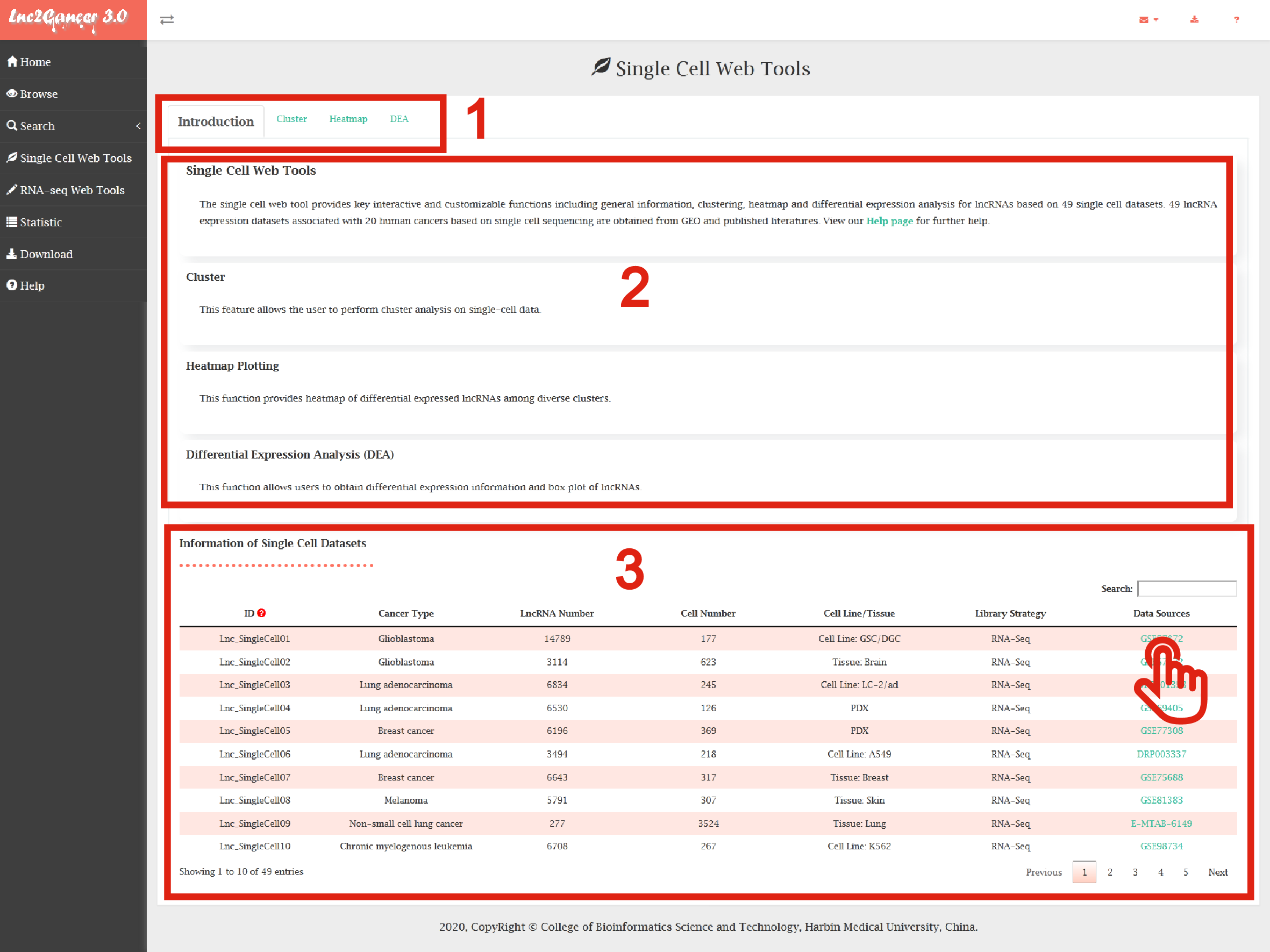 The Single Cell Web Tools provides key interactive and customizable functions including general information, clustering, heatmap and differential expression analysis for lncRNAs based on 49 single cell datasets.