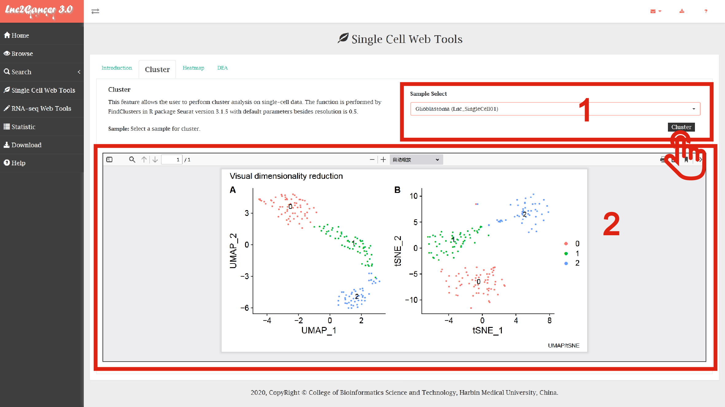 2. Click the "Cluster" button: Cluster function will generate a cluster plot of cluster analysis based on lncRNA expression using high-dimensional reduction method tNSE and UMAP.
