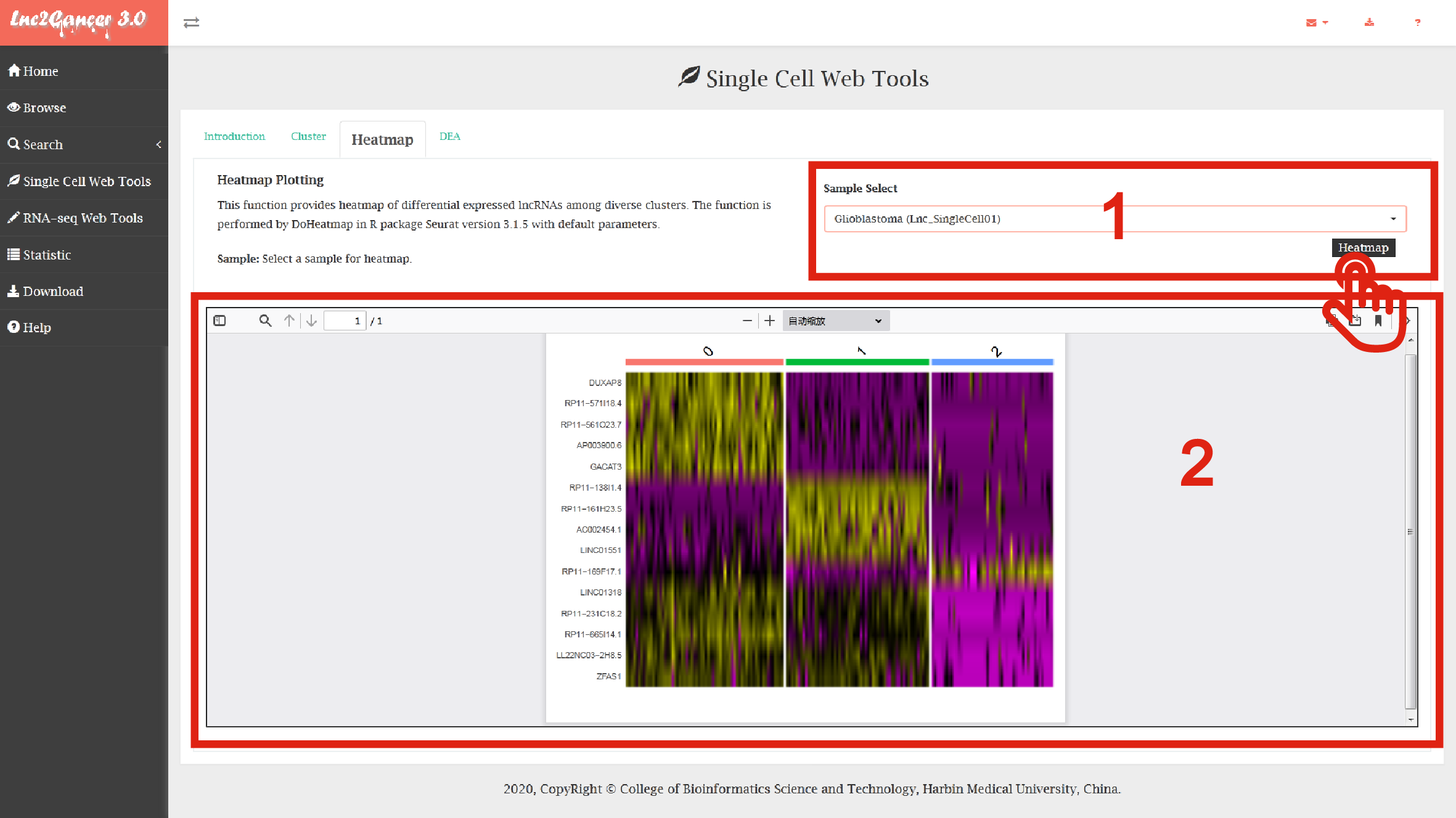 2. Click the "Heatmap" button: Heatmap function will generate a heatmap of cluster analysis based on selected single cell dataset.
