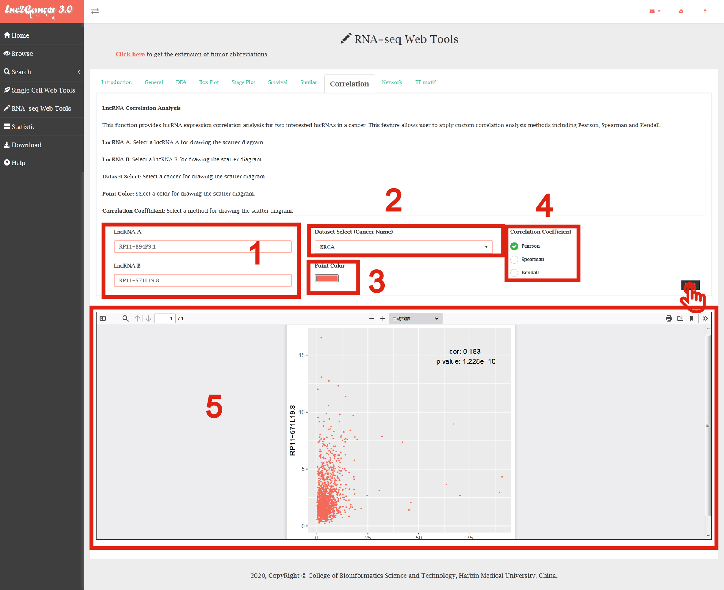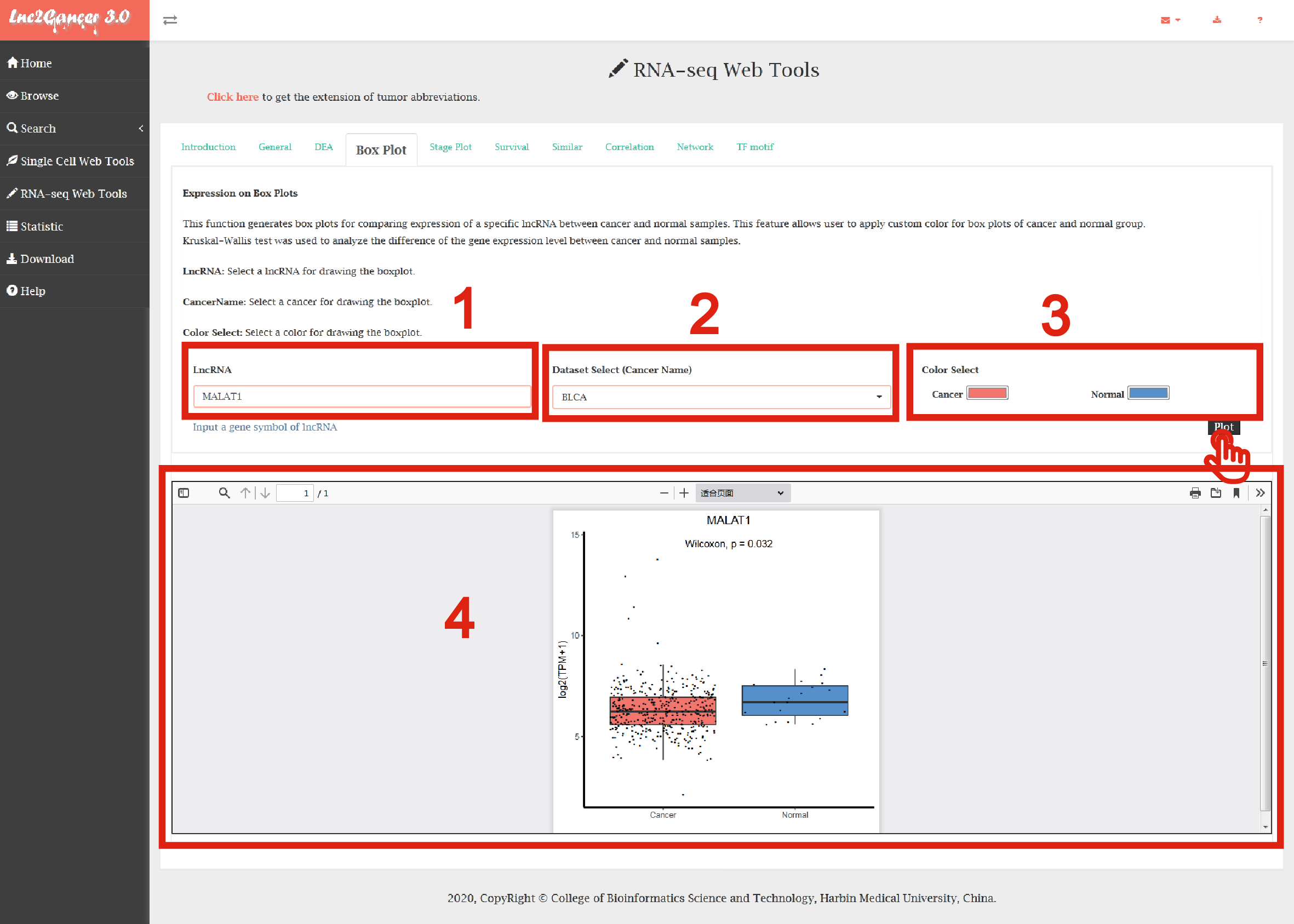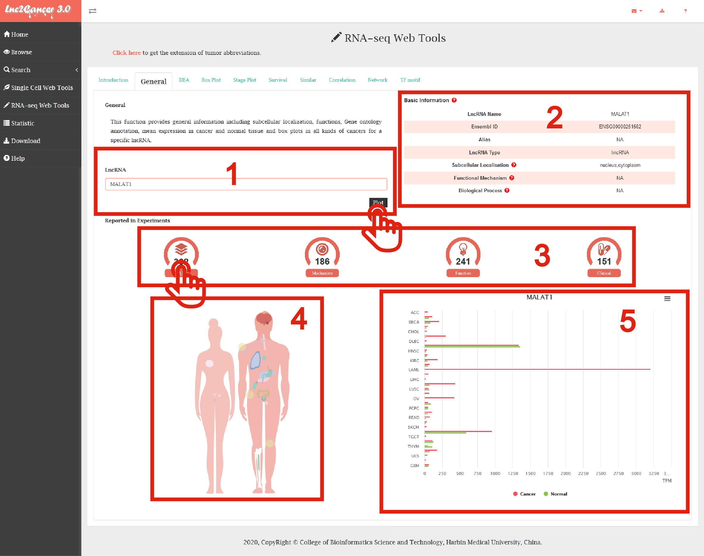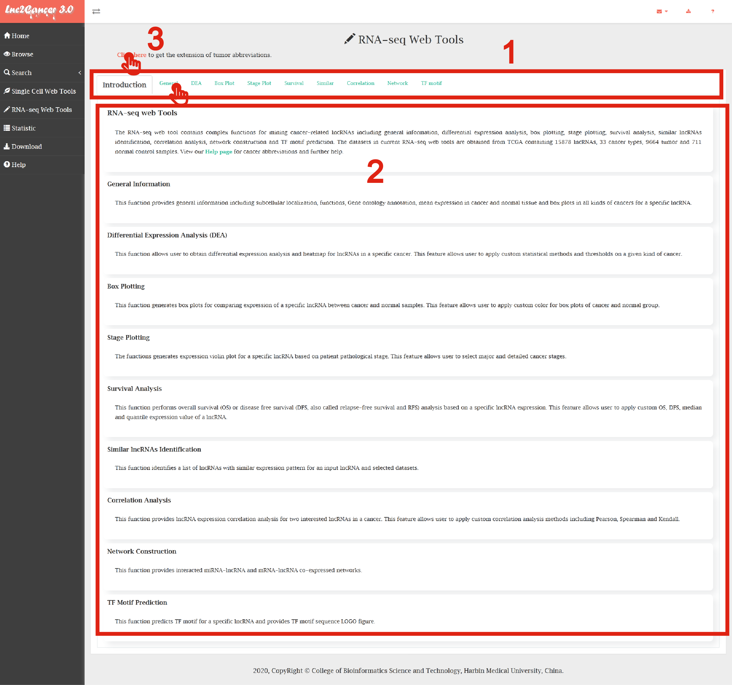 The RNA-seq Web Tools contained complex functions for mining cancer-related lncRNAs including general information, differential expression analysis, box plotting, stage plotting, survival analysis, similar lncRNAs identification, correlation analysis, network construction and TF motif prediction.