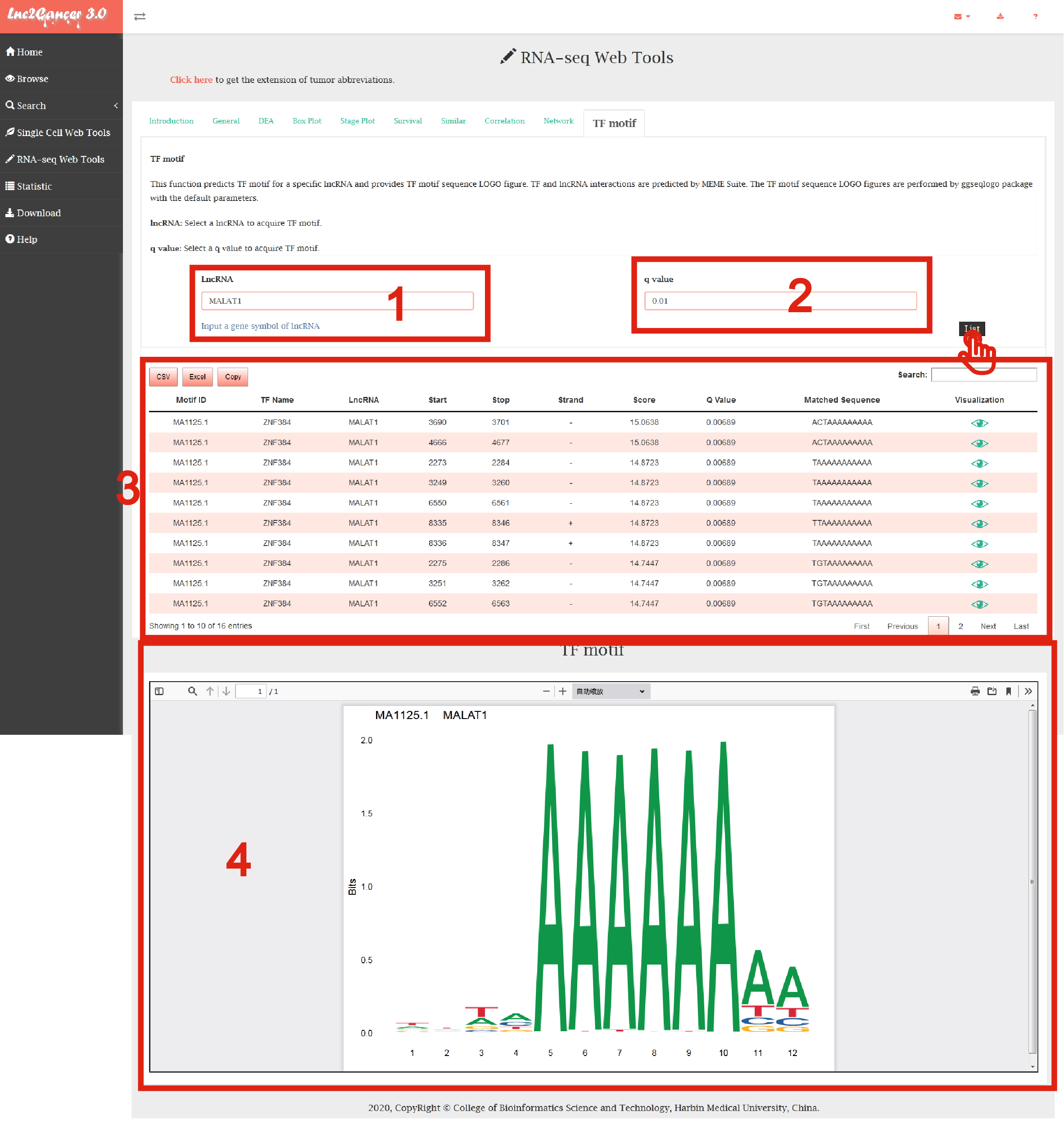 This function predicts TF motif for a specific lncRNA and provides TF motif sequence LOGO figure is displayed in Figure 7-10: