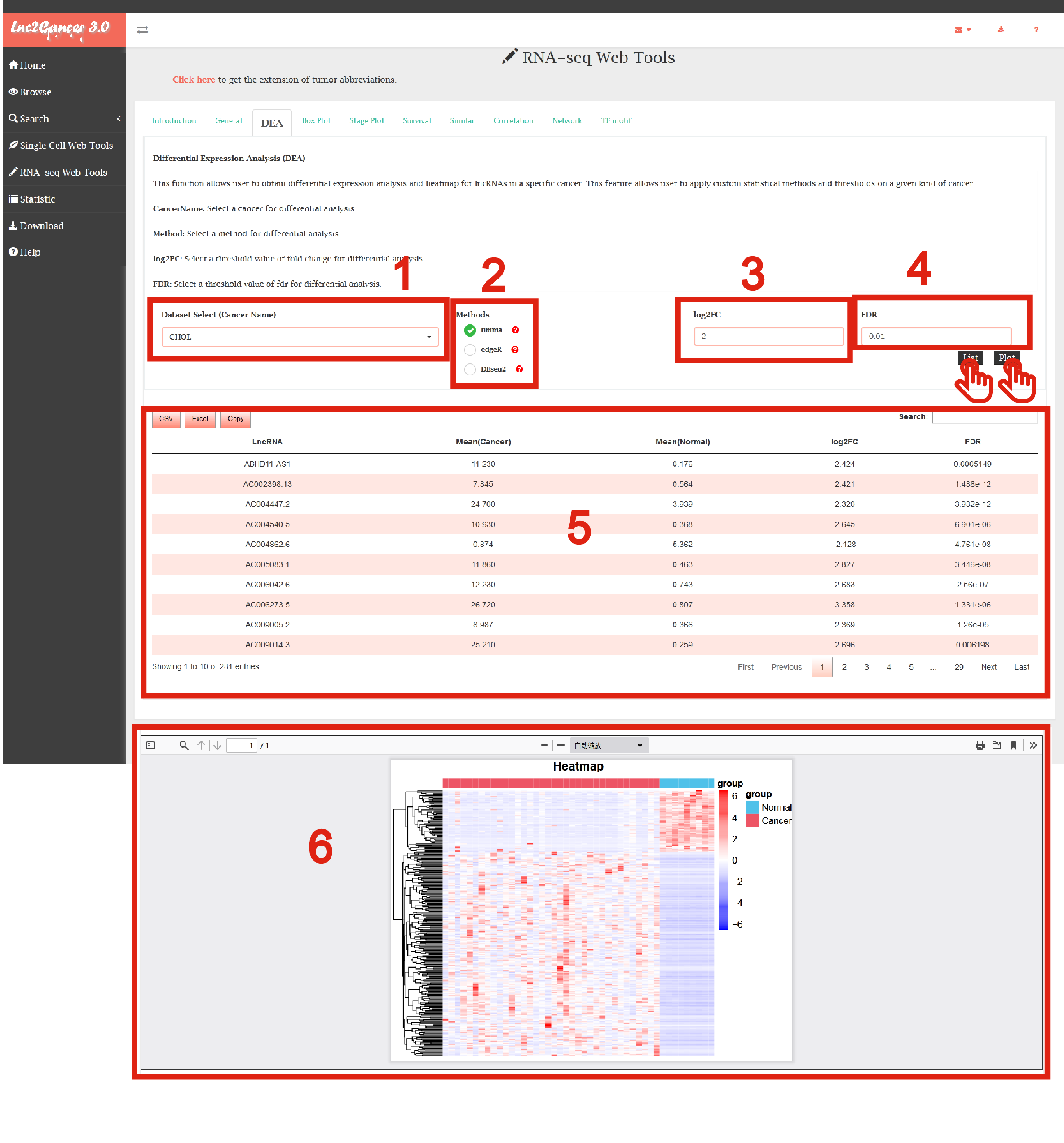 6. Click the "Plot" button: DEA function will generate a heatmap of differentially expressed lncRNAs based on input parameters.