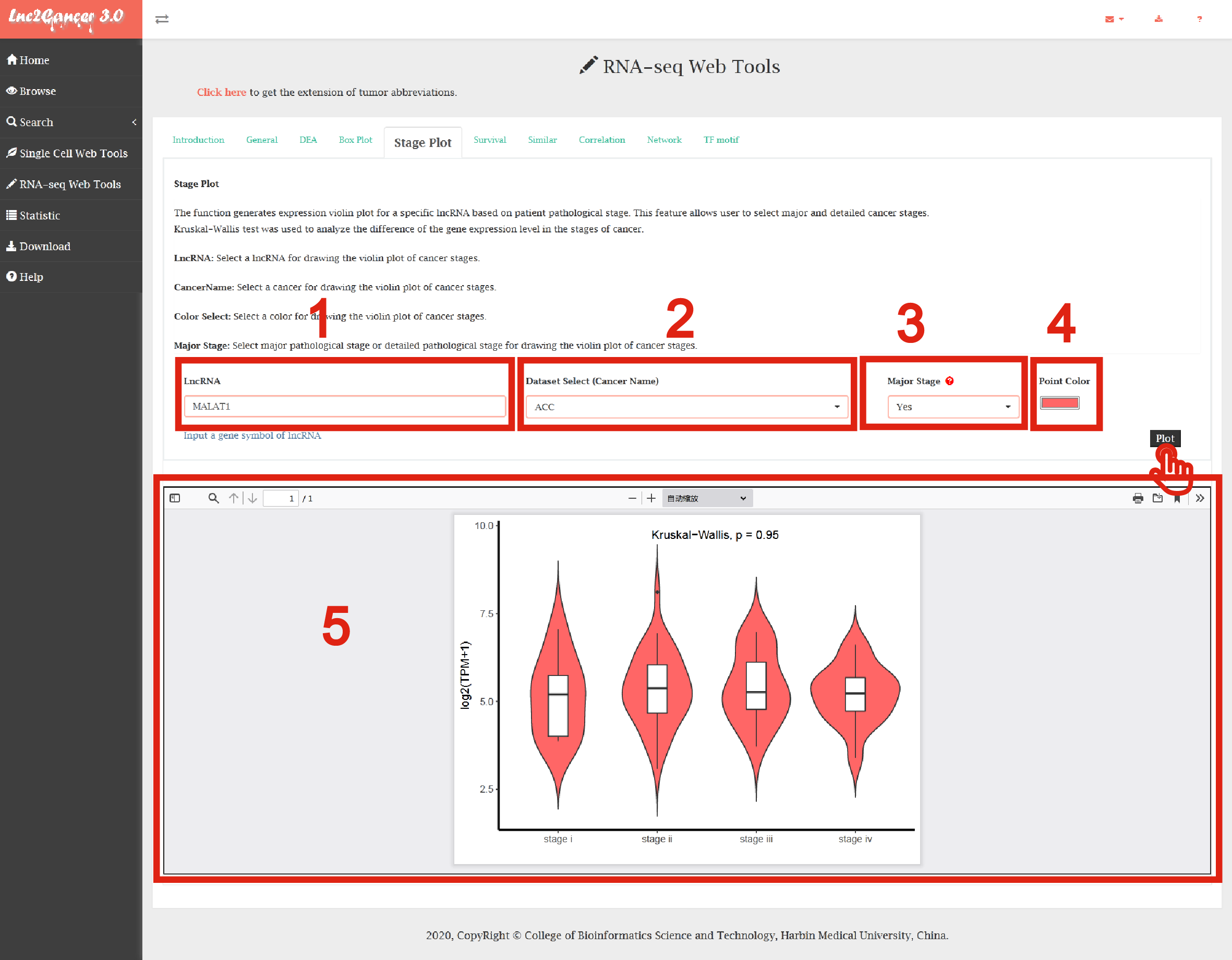 5. Click the "Plot" button: Stage Plot function will generate a violin plot for comparing expression in pathological stage based on input parameters.