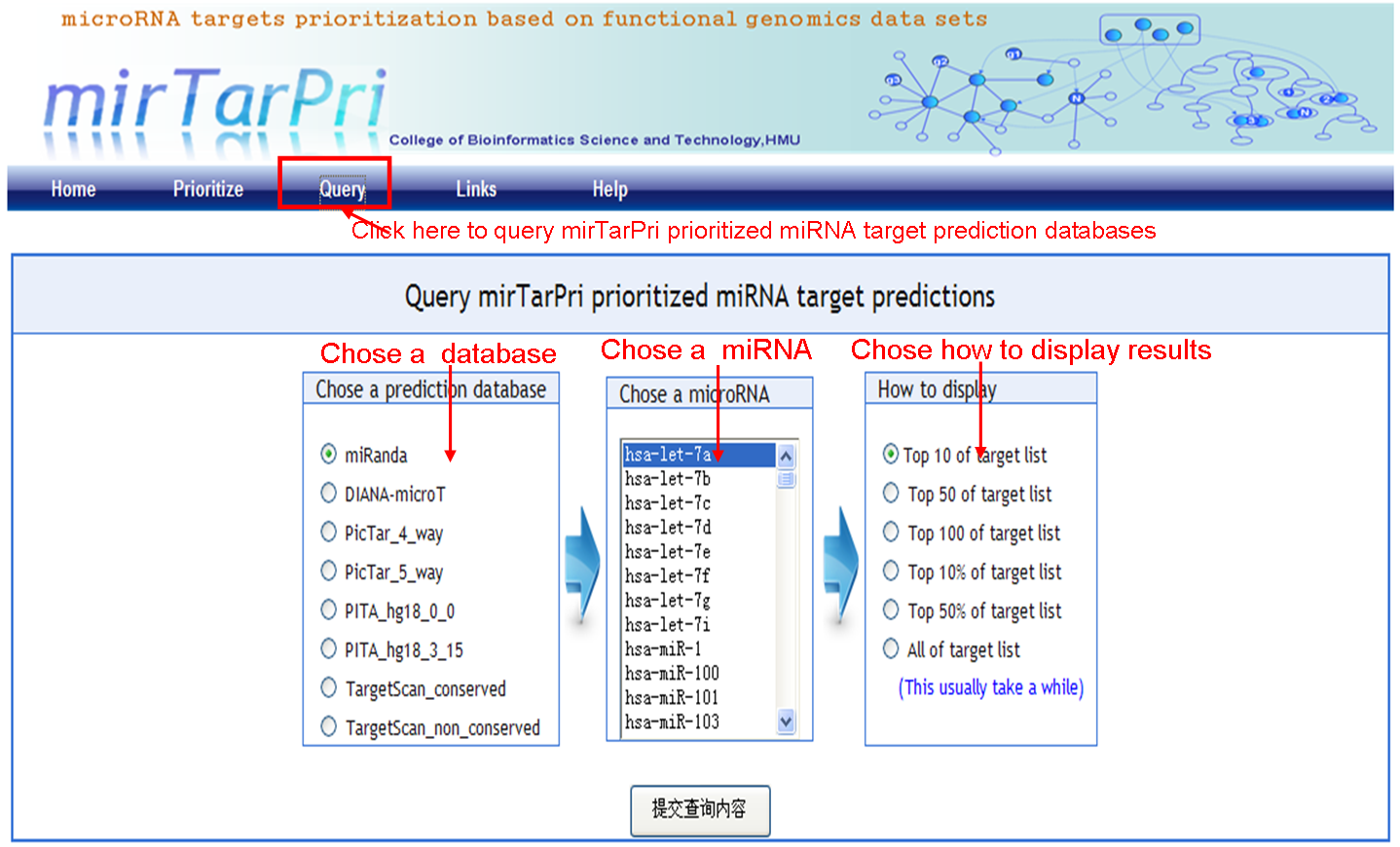 Candidtaed gene list is queried by supplying either gene symbol or Entrez ID, using a comma-delimited data format. For the given query, mirTarPri provides three branches of Gene Ontology and Six human protein-protein networks as functinal dataset to use.