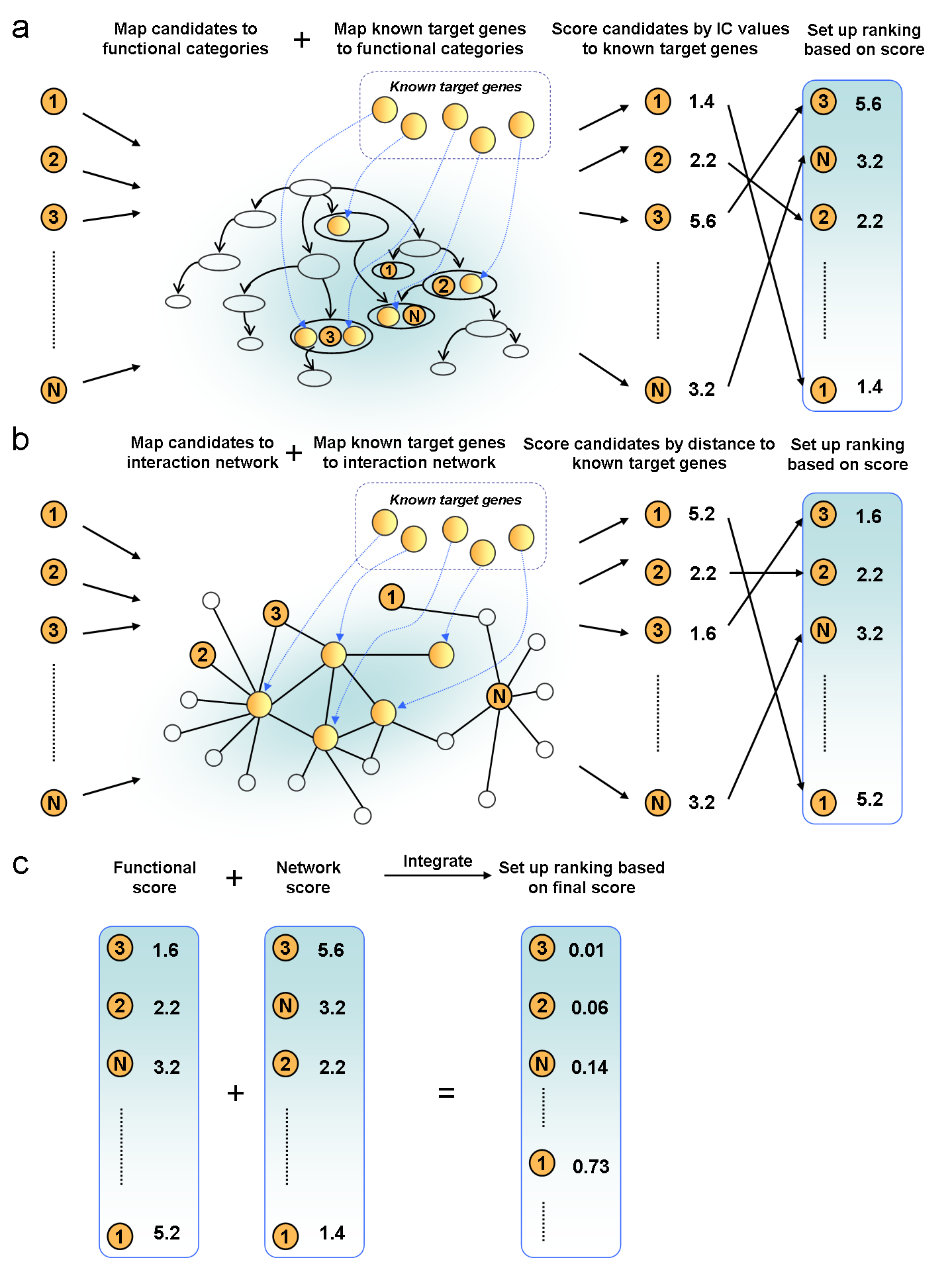 In the third step (lower area), for each candidate target: two rankings based on FC score and NC score are combined into a single ranking using the Q statistic method. For each rank, the Q statistic method provides an integrated score. This ranking provides an overall prioritisation for each candidate gene list.