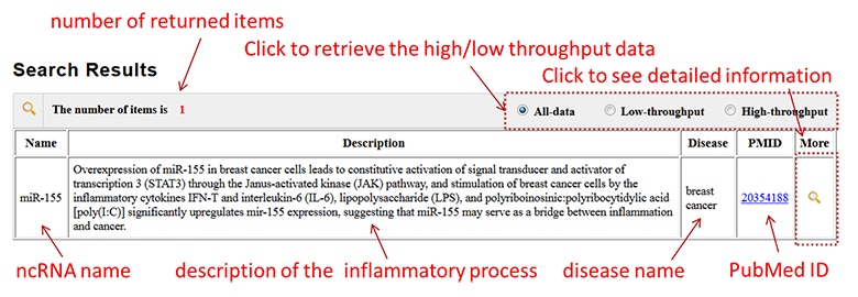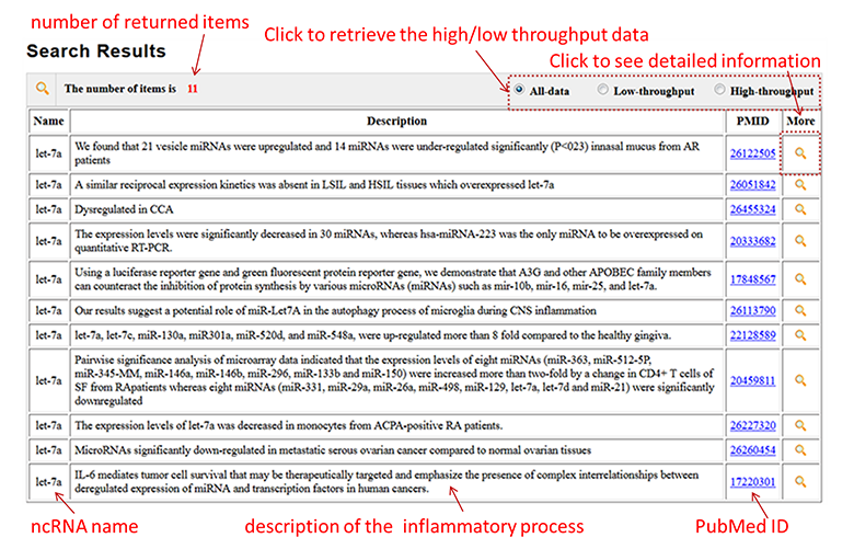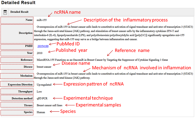 Non-coding RNAs in Inflammation (ncRI) provides a manually curated database for experimentally validated non-coding RNAs in inflammation. Inflammation is a series of the complex biological response of body tissues to harmful stimuli, such as pathogens, damaged cells, or irritants, and is a protective response involving immune cells, blood vessels, and molecular mediators. Recently, inflammation is considered to be central to the onset, progression, and outcome of infectious and noninfectious diseases, especially believed as a hallmark of cancer. In addition, the inflammatory agents, such as cytokines and chemokines, can regulate the behavior of the immune system and involve in the immunotherapy. For example, IL-2 can enhance anti-tumor activity and is used in the treatment of malignant melanoma and renal cell carcinoma. With the discovery of non-coding RNAs (miRNA, lncRNA and so on), a further level of complexity in the control of immunity and inflammation processes at a molecular level arouses interest in research. NcRNAs play important roles in the inflammation processes and represent new potential targets for immunotherapy. For example, miR-9 significantly repressed NF-kB expression, and thereby promoted lymphatic endothelial cell (LEC) tube formation in lymphatic inflammatory processes. The expression of miR-146a was significantly increased in rheumatoid arthritis (RA), positively correlated with expression level of TNF-alpha in CD4+ T cells, and critically involved in modulating T cell apoptosis. MiR-155 was induced during the macrophage inflammatory response, and pharmacological inhibition of the kinase JNK blocked induction of miR-155 in response to TNF-alpha, suggesting that miR-155 could be an effective target for anti-inflammation .