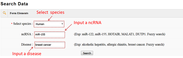 | Users can input the interested ncRNA and disease of selceted species to retrieve the data |