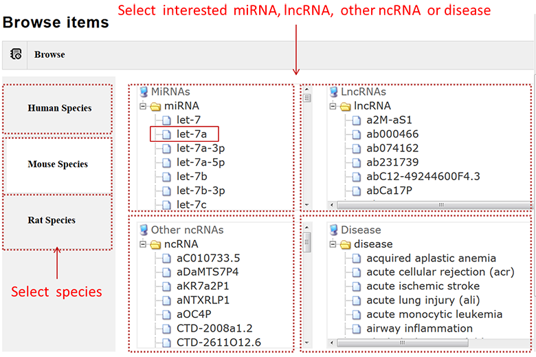 | Users can browse the interested micRNA, lncRNA,other ncRNA and disease in selceted species |
