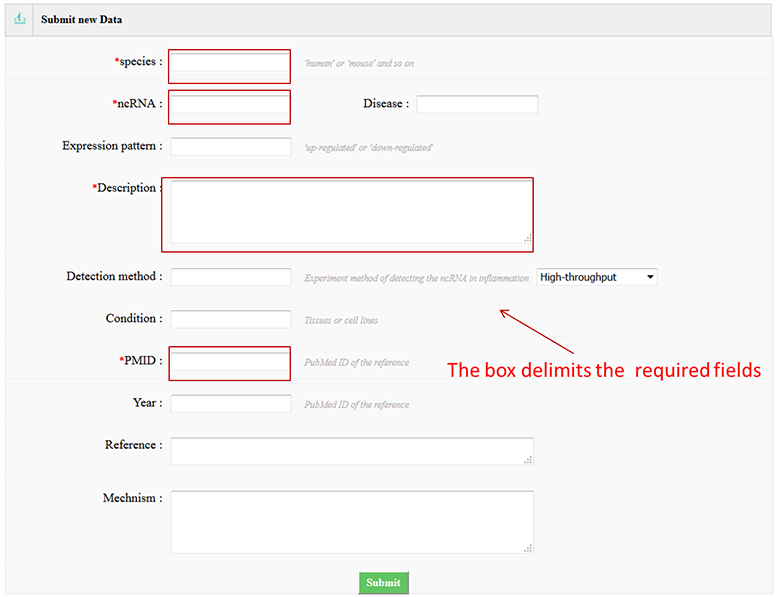 | Users can submit the new data to the ncRI. The red star represents the required items |
