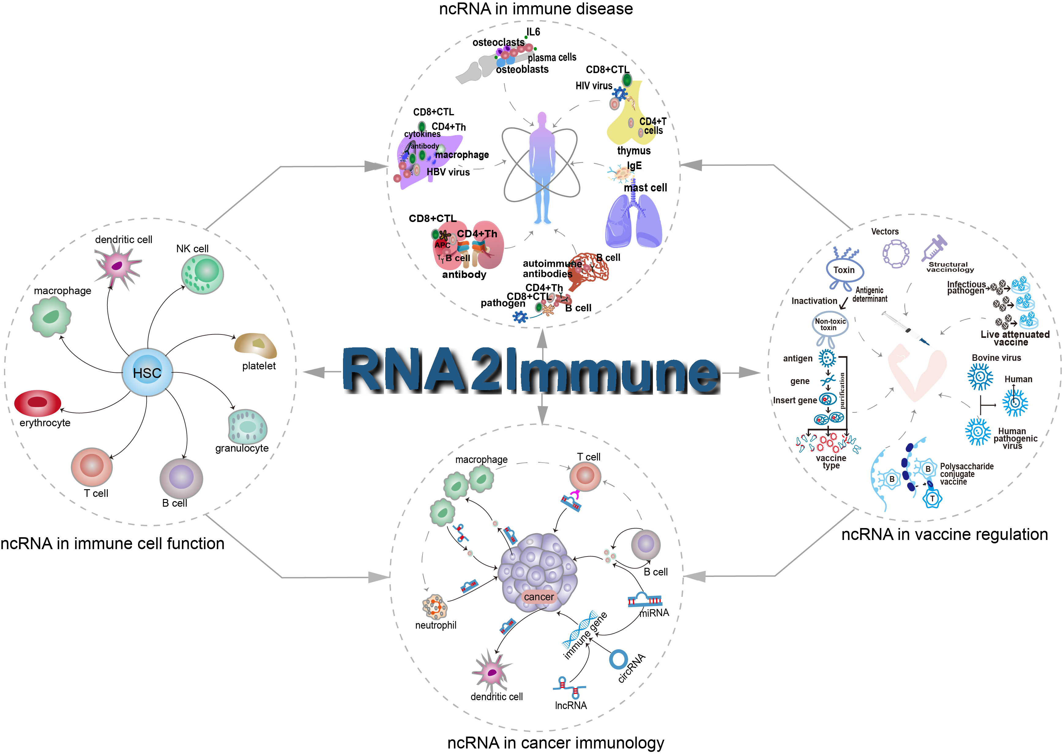 There is now overwhelming evidence that ncRNAs play pivotal roles in the regulation of immune system. First, ncRNAs regulate the innate and adaptive immune cell development and function. Furthermore, when ncRNAs are aberrantly expressed they can contribute to pathological conditions involving the immune system. In addition, ncRNAs can participate in the development of cancer by interacting with tumor immune microenvironment. Importantly, ncRNAs show great significance in modulating vaccine mediated innate and adaptive immune responses and disease prevention. To decode these series of regulation by ncRNAs, we describe a comprehensive database, RNA2Immune, which provides experimentally supported associations about ncRNA in immune regulation.
