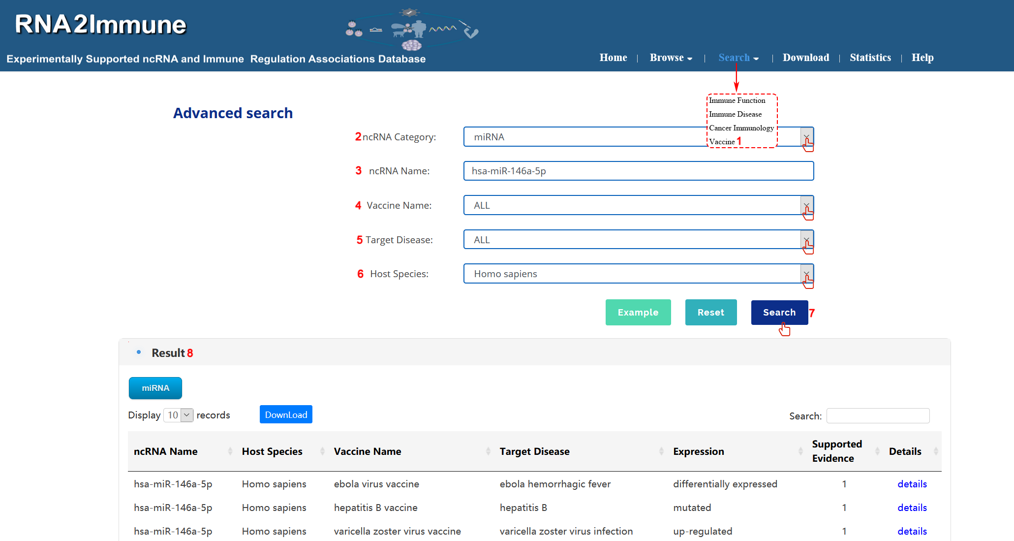 Vaccine search: To search vaccine part of the database, please click the menu ‘Search’, then select ‘Vaccine’ (1 in figure 10 below). Users can select particular ncRNA category in search box (2 in figure 10 below). Input your interested ncRNA symbol in the 'ncRNA Name' search box (3 in Figure 10 below). Then choose all vaccine name or particular vaccine from the pull-down menu (4 in figure 10 below). Select all target disease or your interested disease in the search box (5 in figure 10 below). Choose all host species or particular species from the pull-down menu (6 in figure 10 below). At last, click the search button, the system will return to a table showing all entries (7,8 in figure 10 below). (As shown in figure 10 below, we take an example to explain).