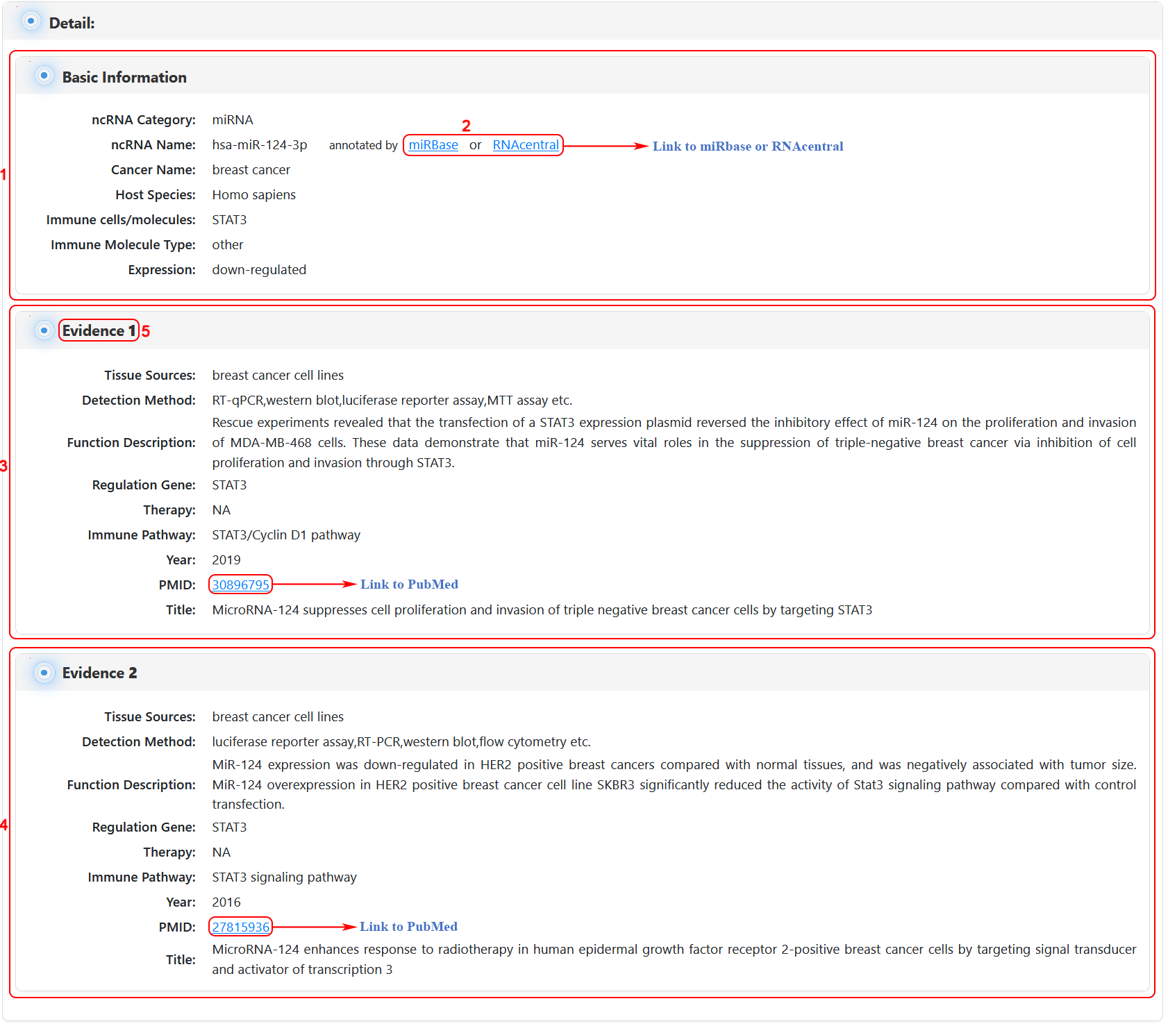 Users can obtain detailed information from each supported ncRNA by clicking the 'more details' of the data table. In the detail page, users can obtain basic information for the ncRNA (1 in figure 11 below). Then, users can search the external annotation information for the ncRNA by clicking on the corresponding hyperlink (2 in figure 11 below). Moreover, users can obtain detailed information for the ncRNA and Immune Function, Immune Disease, Cancer Immunology or Vaccine (3,4 in figure 11 below). Finally, users can get information of each ncRNA from various supporting evidence (5 in figure 11 below).