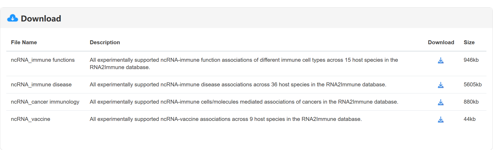 To download data in the database, select the menu 'Download'. RNA2Immune database provides downloadable file in TXT format. Users can download all data sets, which include four files: (i) All experimentally supported ncRNA-immune function associations of different immune cell types across 15 host species; (ii) All experimentally supported ncRNA-immune disease associations across 36 host species; (iii) All experimentally supported ncRNA-immune cells/molecules mediated associations of cancers; (iv) All experimentally supported ncRNA-vaccine associations across 9 host species (figure 12).
