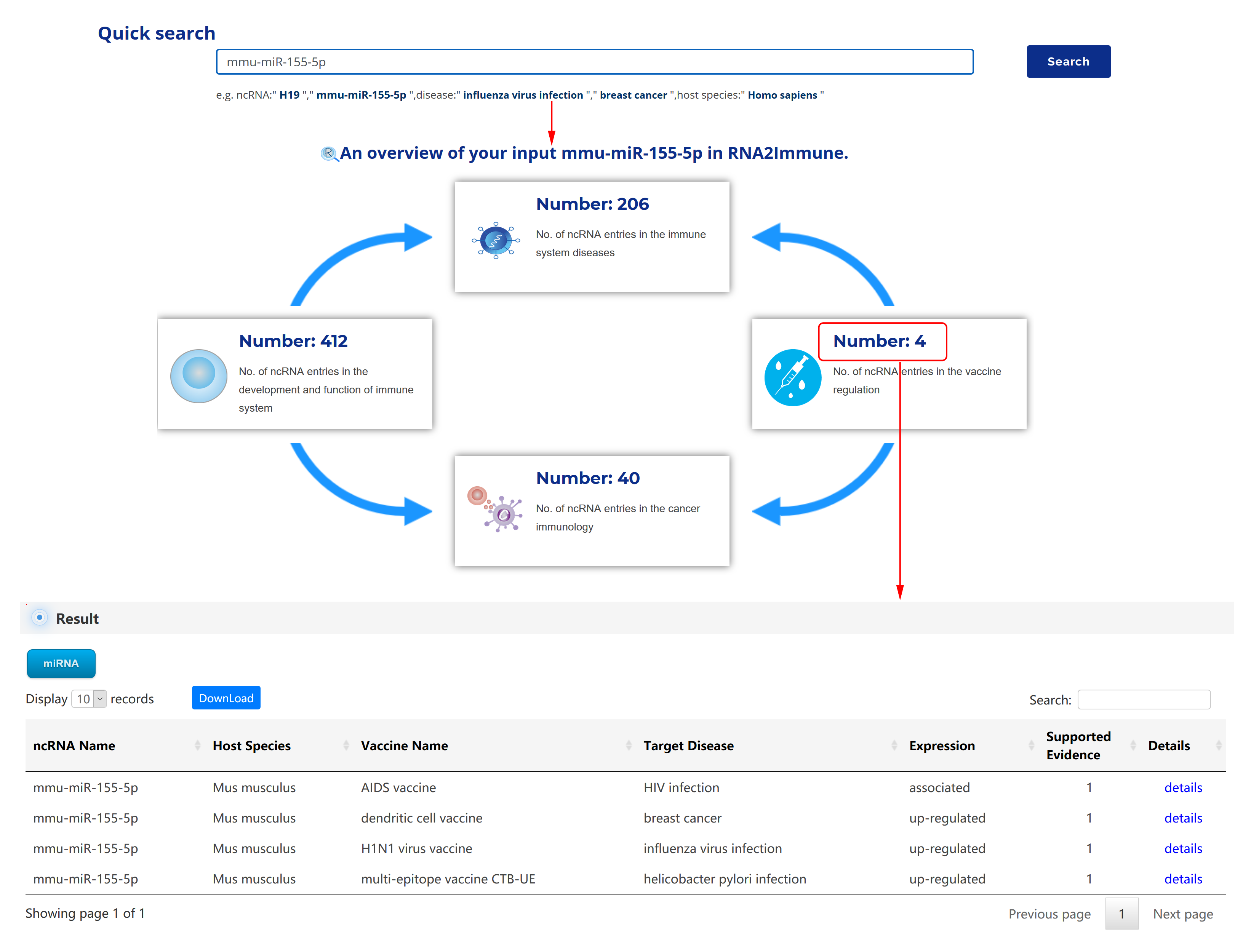 User can query the RNA2Immune database through Quick Search. Users can input an ncRNA or disease name or host species to search ncRNA-immune function associations, ncRNA-immune disease associations, ncRNA-immune cells/molecules mediated associations of cancers and ncRNA-vaccine associations. By clicking the "Number", a corresponding dataset will be displayed (as figure 2 below showing, taking the miRNA 'mmu-miR-155-5p' for example).