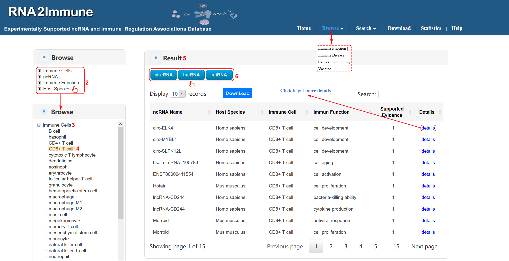 Immune function browse: To browse immune function part of the database, please click the menu ‘Browse’, then select ‘Immune Function’ (1 in figure 3 below). The browse page is classified by hierarchical piths of immune cells, ncRNA, immune function and host species. To browse the entries related a particular immune cell (for example CD8+ T cell), please click ‘Immune Cells’ (2, 3 in figure 3 below), then select ‘CD8+ T cell’ (4 in figure 3 below) in the catalog below. The result will be displayed on the right column (5 in figure 3 below). Various categories of ncRNA can be chosen in result column (6 in figure 3 below).