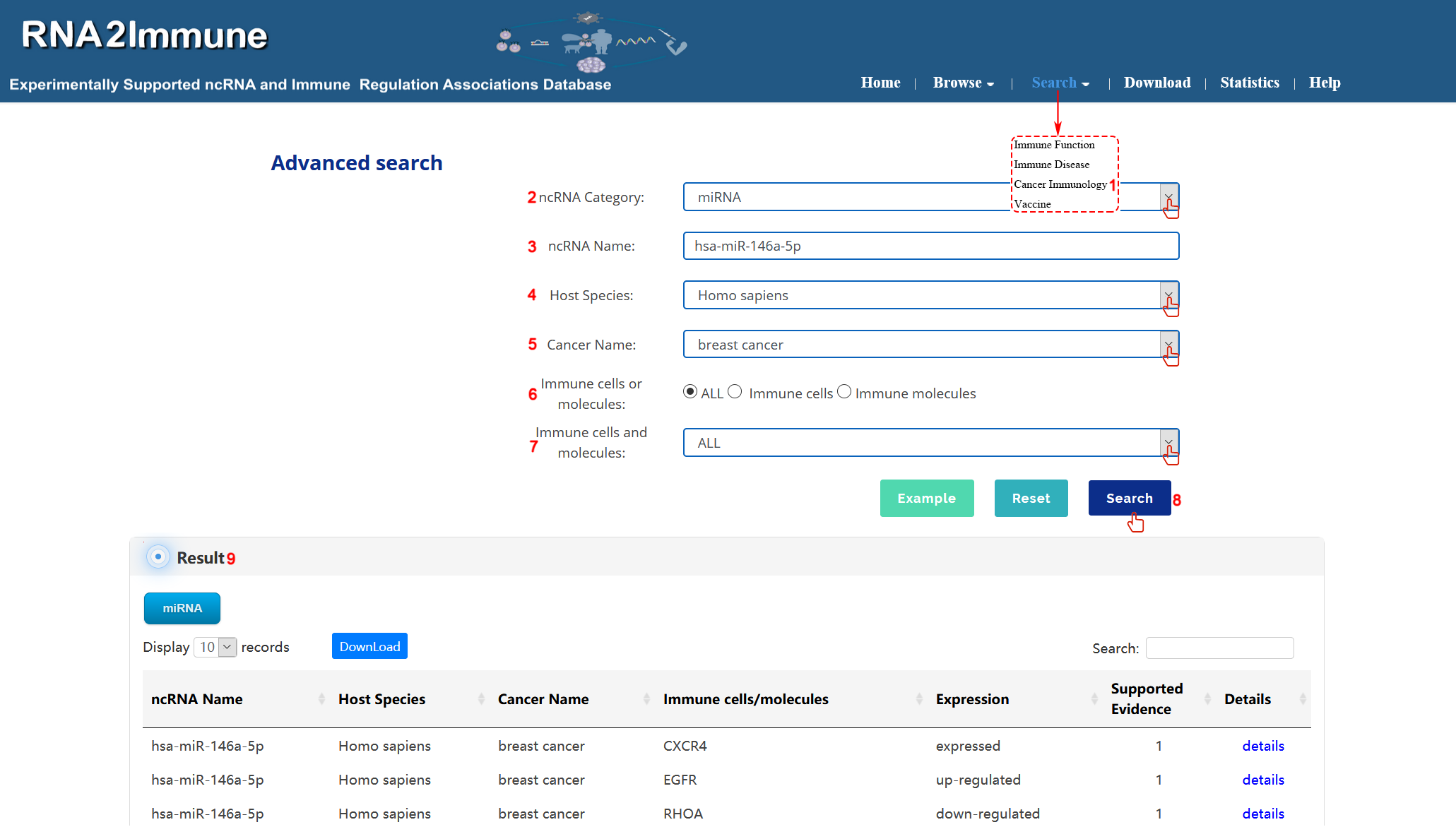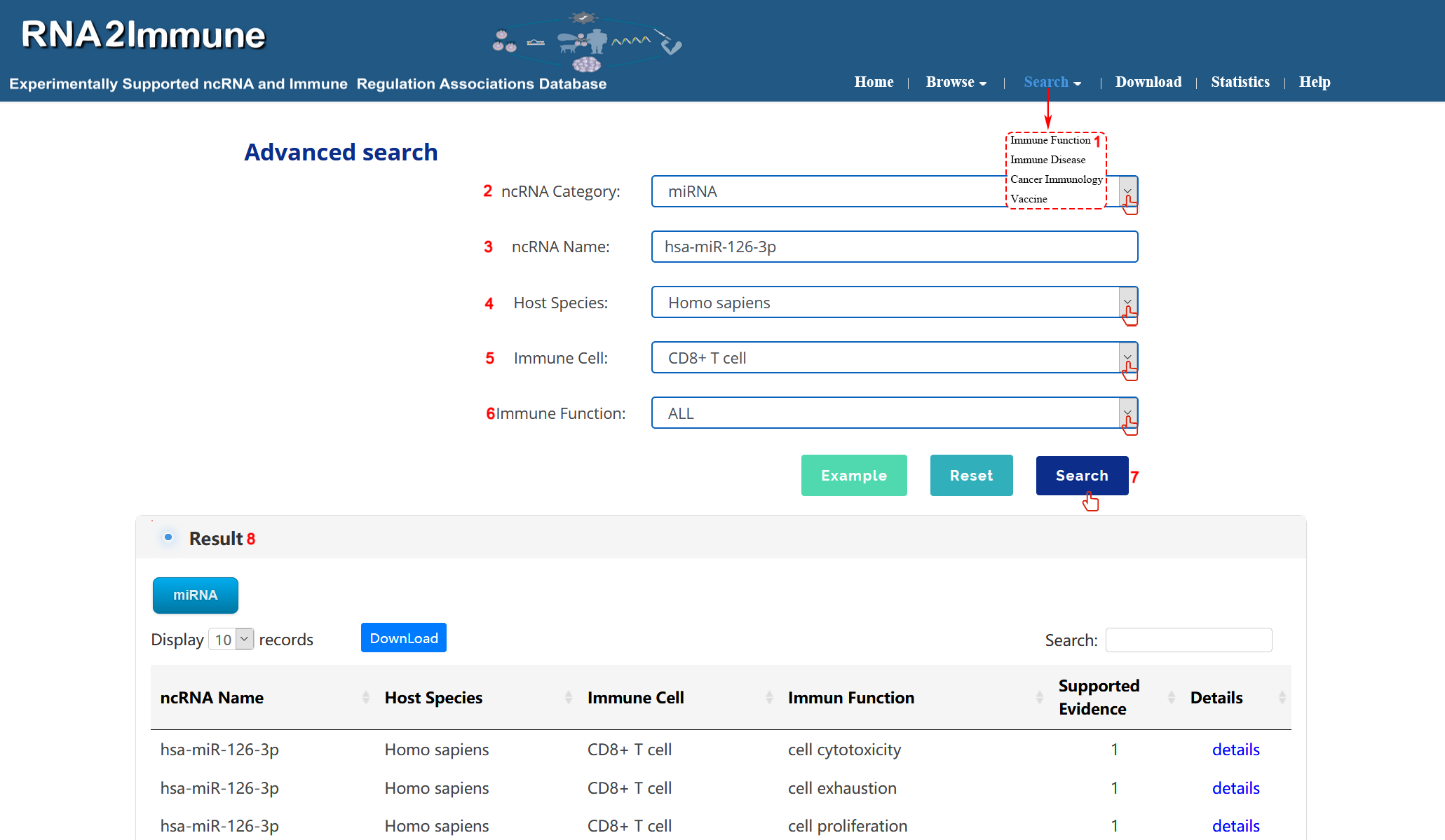 Immune Function search:To search Immune Function part of the database, please click the menu ‘Search’, then select ‘Immune Function’ (1 in figure 4 below).The Immune Function Search page provides Quick Search and Advanced Search. We have introduced Quick Search above. The Immune Function Advanced Search page allow user to search by combination of different key words. Users can select particular ncRNA Category from the pull-down menu (2 in figure 4 below). Input your interested ncRNA symbol in the 'ncRNA Name' search box (3 in Figure 4 below). Users can select all host species or particular species from the pull-down menu (4 in figure 4 below).Then, users can select the interested 'Immune cell' and 'Immune Function' in search box(5,6 in figure 4 below). At last, click the search button, the system will return to a table showing all entries (7,8 in figure 4 below).( As shown in figure 4 below, we take an example to explain).
