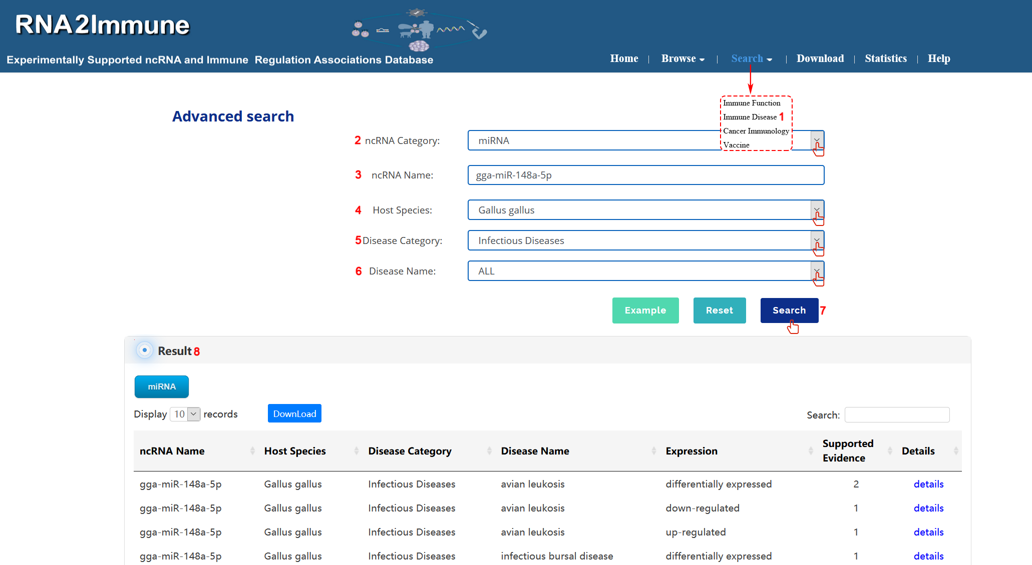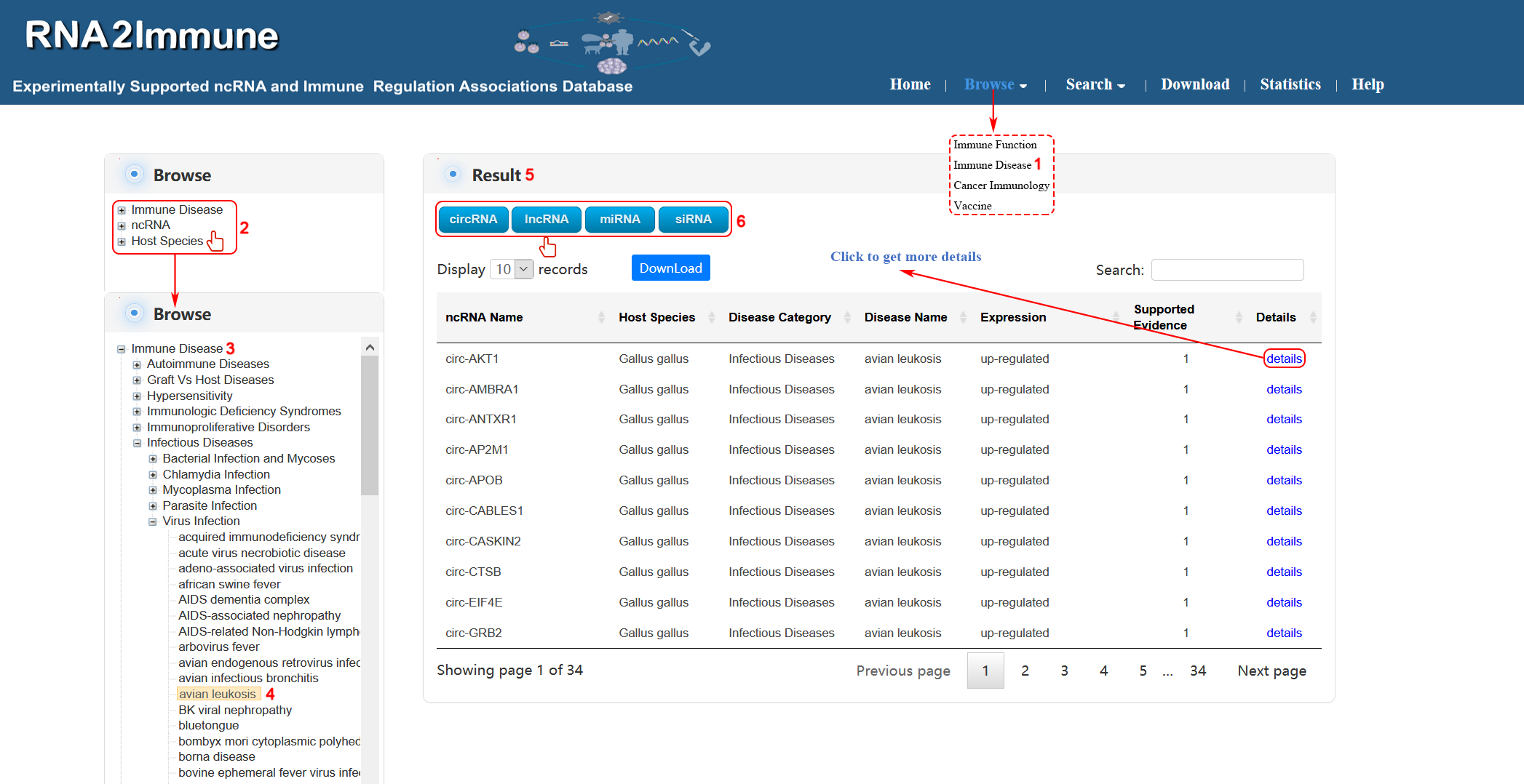 Immune disease browse: To browse immune disease part of the database, please click the menu ‘Browse’, then select ‘Immune Disease’ (1 in figure 5 below). The browse page is classified by hierarchical piths of immune disease, ncRNA and host species (2 in figure 5 below). To browse the entries related a particular immune disease name(for example avian leukosis), please click ‘Immune Disease’(3 in figure 5 below), then choose the subcategory ‘Infectious Diseases’, and select ‘Virus Infection’ which is corresponding disease ‘avian leukosis’(4 in figure 5 below) in the catalog below. The result will be displayed on the right column (5 in figure 5 below). Various categories of ncRNA can be chosen in result column (6 in figure 5 below).
