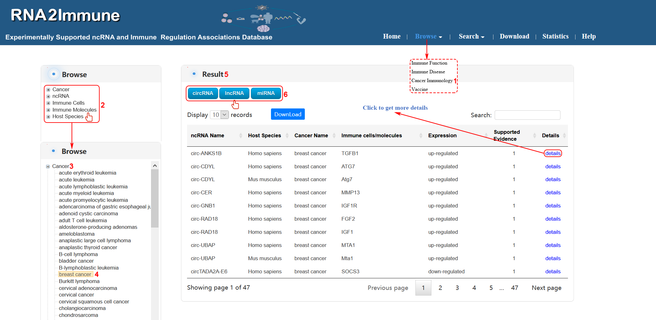 Cancer immunology browse: To browse cancer immunology part of the database, please click the menu ‘Browse’, then select ‘Cancer Immunology’ (1 in figure 7 below). The browse page is classified by hierarchical piths of cancer, ncRNA, immune cells, immune molecules and host species (2 in figure 7 below). To browse the entries related a particular cancer (for example breast cancer), please click ‘cancer’ (3 in figure 7 below), then select ‘breast cancer’ (4 in figure 7 below) in the catalog below. The result will be displayed on the right column (5 in figure 7 below).Various categories of ncRNA can be chosen in result column (6 in figure 7 below).