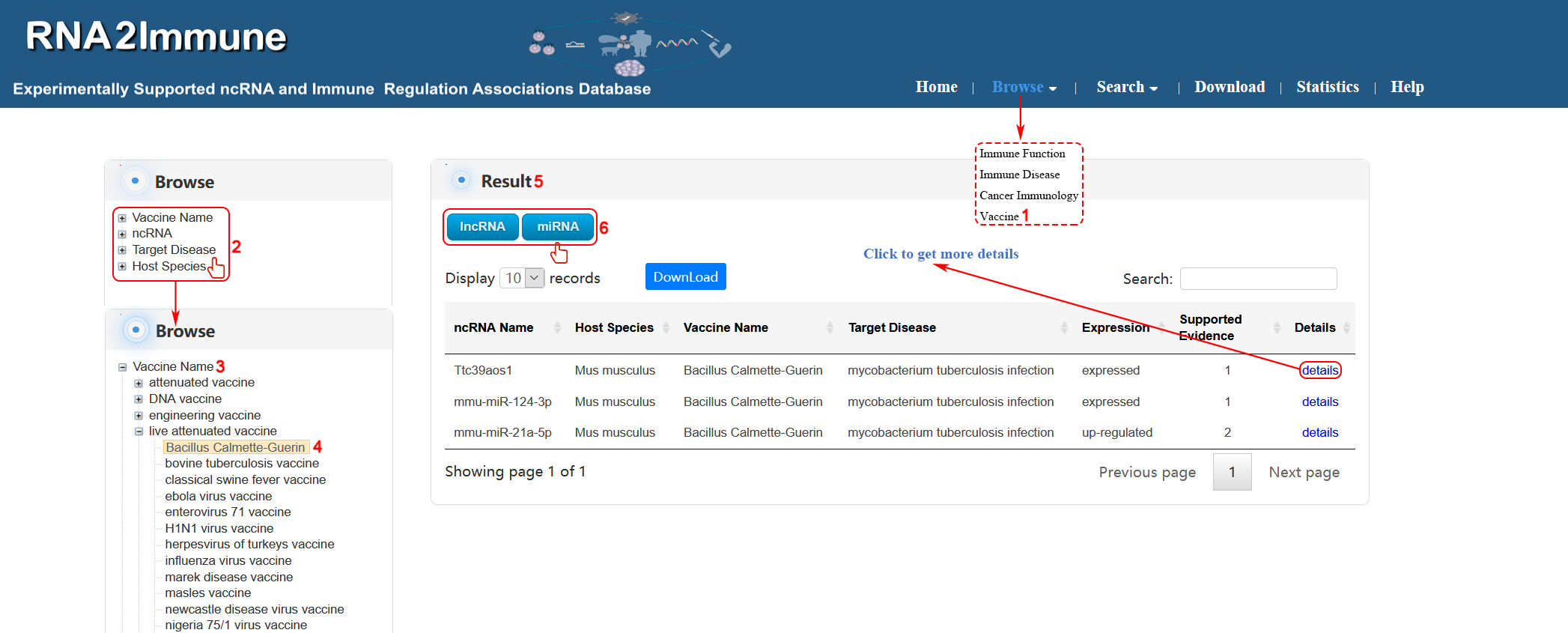 Vaccine browse: To browse vaccine part of the database, please click the menu ‘Browse’, then select ‘Vaccine’ (1 in figure 9 below). The browse page is classified by hierarchical piths of vaccine name, ncRNA, target disease and host species (2 in figure 8 below). To browse the entries related a particular vaccine name (for example Bacillus Calmette-Guerin), please click ‘Vaccine Name’ (3 in figure 9 below), then select ‘Bacillus Calmette-Guerin’ in the ‘live attenuated vaccine’ catalog below (4 in figure 9 below). The result will be displayed on the right column (5 in figure 9 below).Various categories of ncRNA can be chosen in result column (6 in figure 9 below).