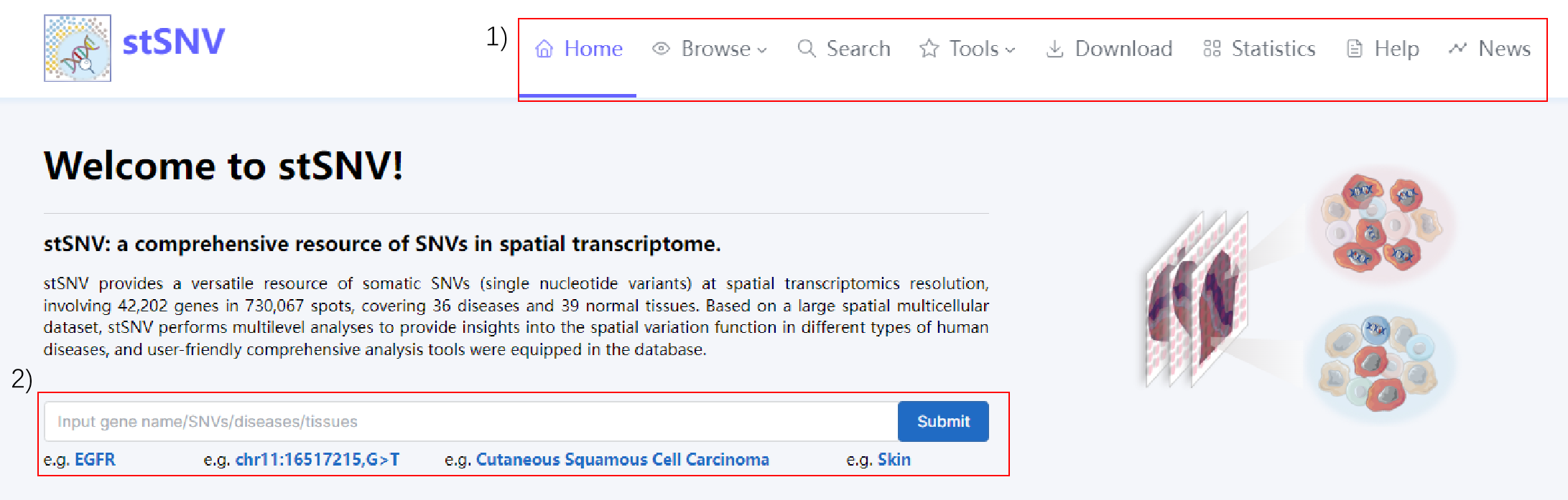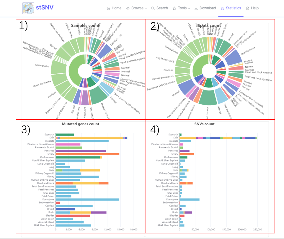 stSNV provides a versatile resource of somatic SNVs (single nucleotide variants) at spatial transcriptomics resolution, involving 21,840 genes in 484,885 spots, covering 27 diseases and 19 normal tissues. Based on a large spatial multicellular dataset, stSNV performs multilevel analyses to provide insights into the spatial variation function in different types of human diseases, and user-friendly comprehensive analysis tools were equipped in the database.